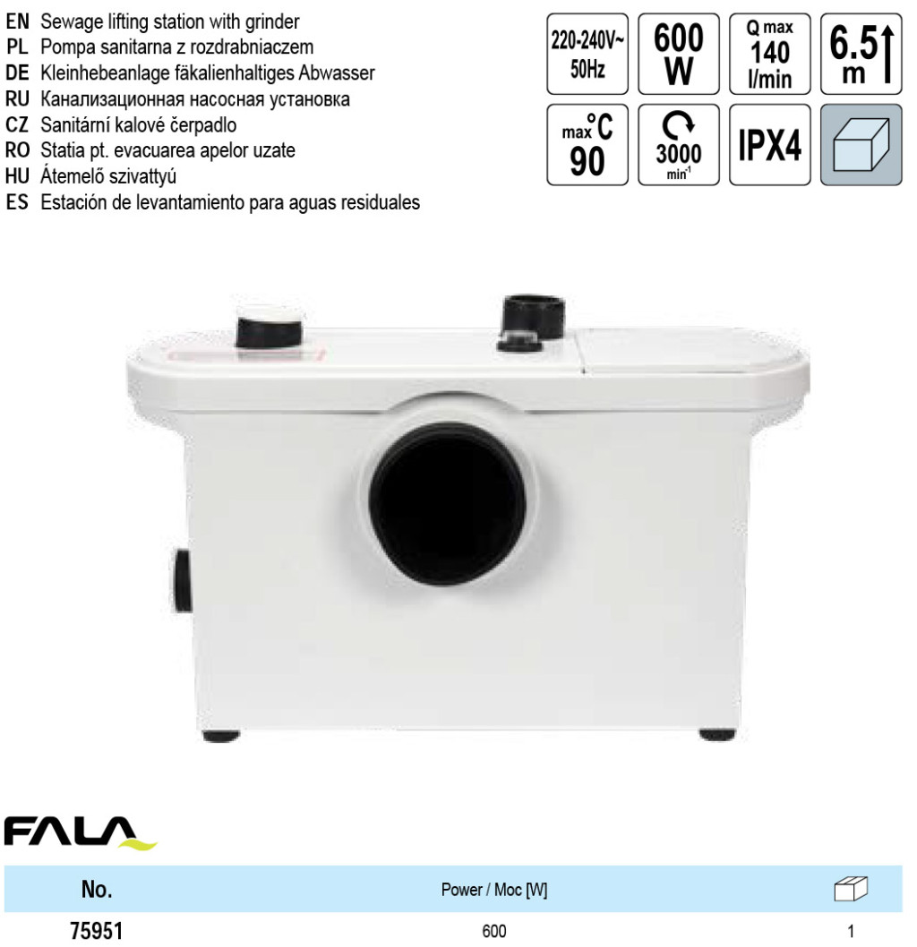 FALA 75951 egy hatékony szennyvíz szivattyú, mely darálóval funkcióval és csendes motorral van felszerelve. A 600 W teljesítménye teljes mértékben elegendő háztartásbeli felhasználásra. Olyan esetekben ajánlott a beszerelése, ahol a kiépített egészségügyi szennyvízhálózatnak nincs meg a kellő leejtése ahhoz, hogy a szennyvíz és az általa hordozott szilárd anyagok a gravitáció segítségével tudjanak a kiépített szennyvízhálózaton végighaladni.