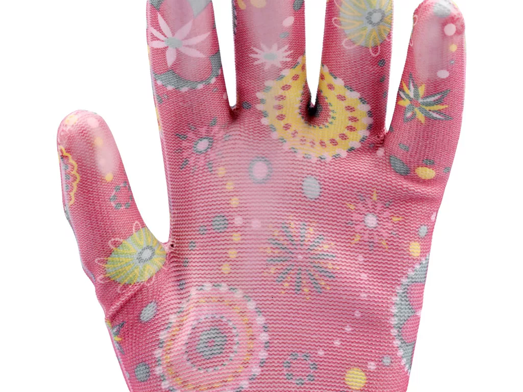 FLO 74132 Kertészkesztyű Rózsaszín Mintával 9-Es, Pu Bevonattal.