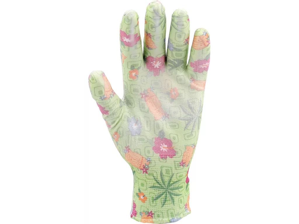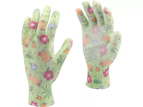 FLO 74134 Kertészkesztyű Zöld Virágmintával 9-Es, Pu Bevonattal.