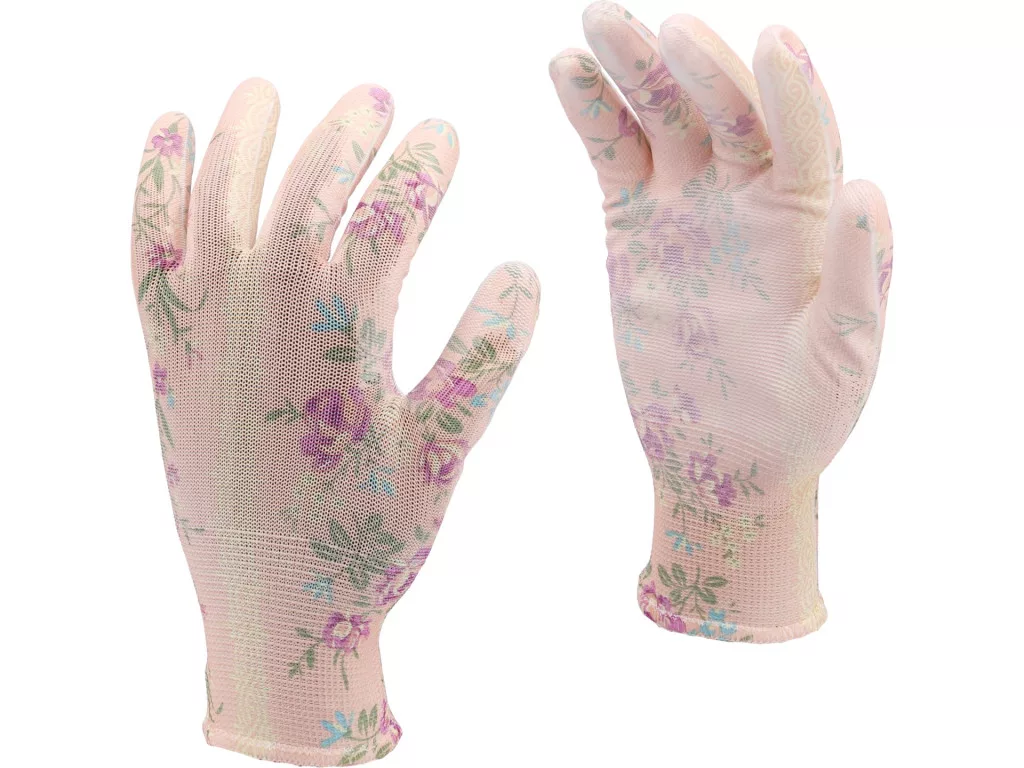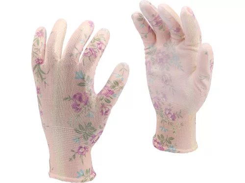 FLO 74136 Kertészkesztyű Rózsaszín Virágmintával 9-As, Pu Bevonattal.