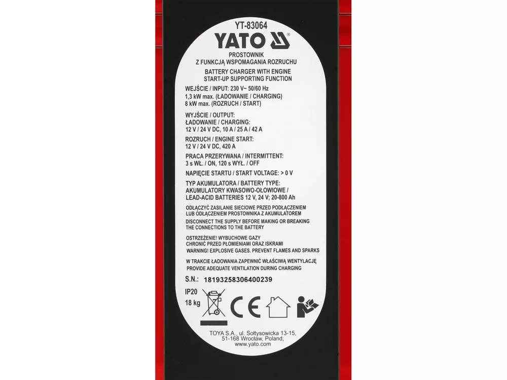 YATO YT-83064 Akkumulátor töltő és indító 12/24V 230V 20 - 800Ah