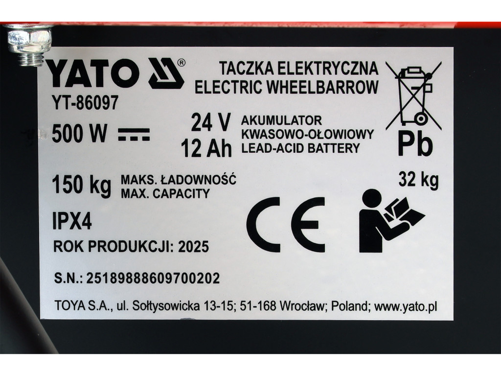 YATO YT-86097 Elektromos hajtású akkumulátoros kerti talicska 500W 150kg