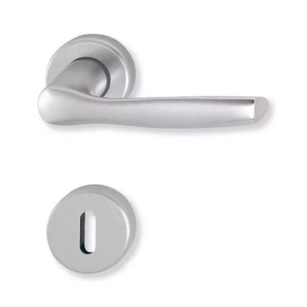 Hoppe Milano rozettás kilincsgarnitúra aluminium színben, beltéri ajtókhoz, kulcslyukas verzióban. Jobbos és balos ajtókon egyaránt alkalmazható a kilincs.